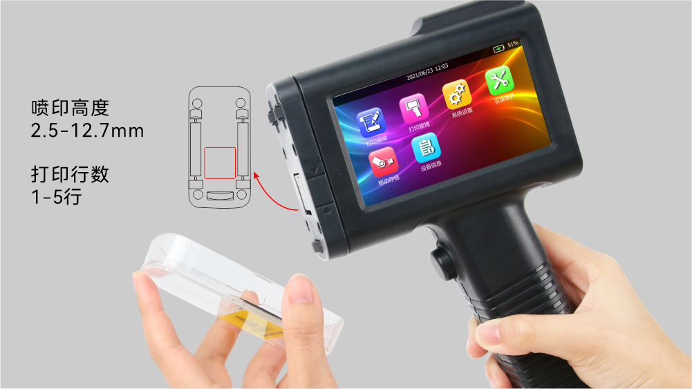 • 直觀的操作 4.3英寸觸摸屏,使用靈敏、流暢 •輔助工具 對于在小面積和不平整表面上噴印需求時,使用輔助定位板可輕松噴印 • 整機重量450g,輕便靈活; • 一機兩用 除手持模式外,可選擇光電模式進行自動連續噴印 • 一物一碼 具有數據庫打印功能,支持可變序列號,可變二維碼、條碼等打印
